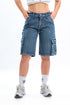 Bermudas de cinco bolsillos en denim rígido. Modelo de talle alto con cierre y botón, bajos naturales, bolsillos a los costados de los muslos y detalle de solapas.
