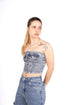 Top corto de escote recto y hombros descubiertos. Dos bolsillos superiores delanteros, detalle de plisado en la parte posterior y cierre vertical de cinco botones. Hecho con material denim confort - semi strech.